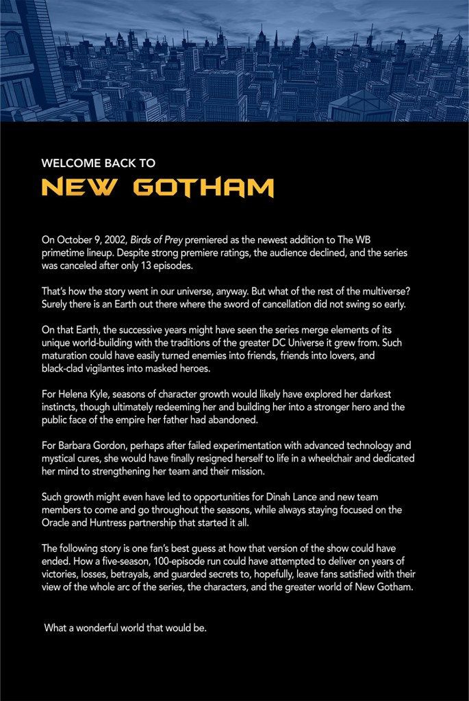 This story was written purely out of love for the 2002 Birds of Prey television series and is not profiting this story’s creators in any way other than fulfilling some very nerdy dreams.